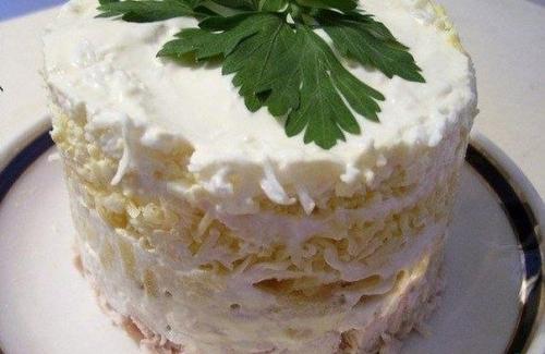 Куриную грудку, отваренную в подсоленной воде, нарезаем мелкими кусочками или разбираем на волокна, мы укладываем первым слоем на дно салатника. Курицу смесью сметаны и майонеза смазываем