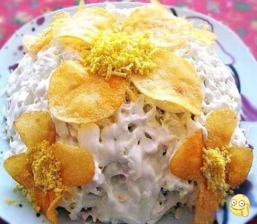 . Из чипсов и натертых на мелкой терке желтков сделать цветки и украсить салат. Приятного аппетита! Удачного и продуктивного дня.