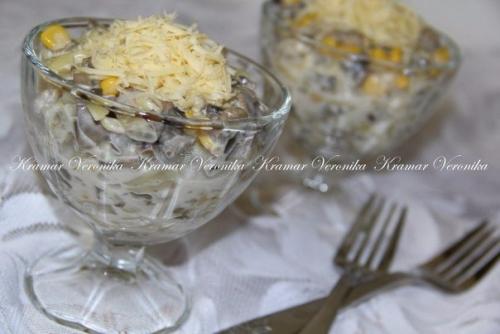 Лук почистить, нарезать. Грибы порезать. Лук и грибы на растительном масле обжарить. Сыр натереть на тёрке. Соединить тёплые грибы и сыр, хорошо перемешать. Добавить кукурузу и майонез, хорошо перемешать