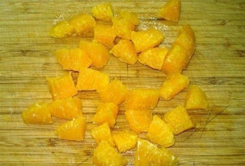 4. апельсин очистить от кожуры. Разобрать на дольки. Каждую дольку очистить от пленок, затем нарезать.
