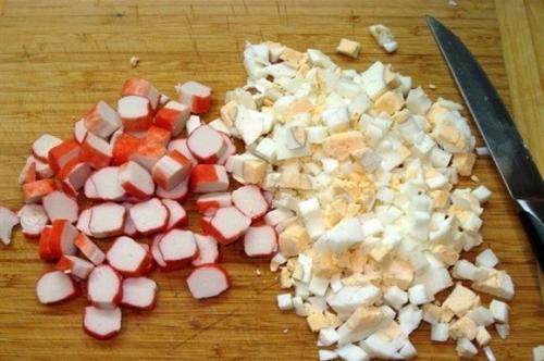 2. яйца очистить и нарезать мелкими кубиками, крабовые палочки поперек, на небольшие ломтики.