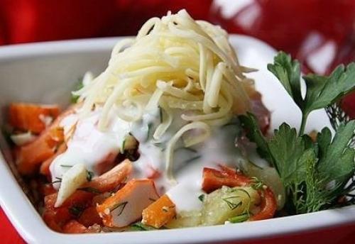 Крабовые палочки - 200 г, картофель - 2 шт., морковь - 1 шт., яйцо - 2 шт., сыр твердых сортов - 50 г, перец болгарский - 1 шт., зелень - 1 пучок, йогурт натуральный, соль, перец.