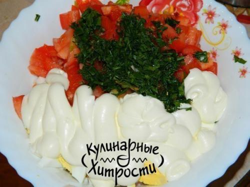 Добавляем порезанные помидоры и зелень. Заправляем салат майонезом и подаем к столу.