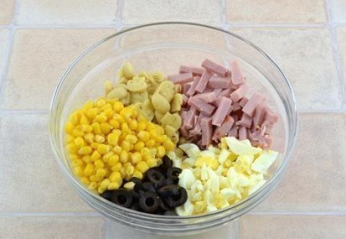 6. переложите все ингредиенты в салатник. Заправьте майонезом. Перемешайте. Таким образом, если надо, подсолите.