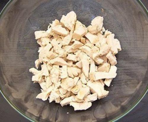 1. мы режем кубиками отваренную куриную грудку. Соломкой режем ветчину. Натираем яйца, сваренные вкрутую, на крупной терке. Кубиками помидоры режем. Режем кубиками маринованные огурцы. Натираем сыр на мелкой терке. Мелко режем зелень.