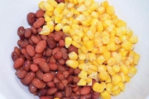 1. с фасоли и кукурузы слить жидкость, выложить в миску.