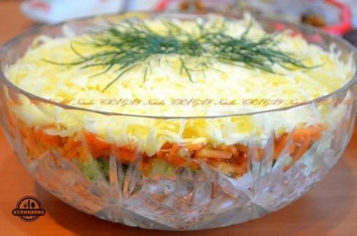 Вареные яйца натереть на терке, выложить на дно салатника. Сделать сеточку из майонеза. Копченую курицу нарезать мелкими кубиками, выложить на яйца. Сделать сеточку из майонеза. На курицу выложить слой огурцов, нарезанных кубиками. Майонезом можно не смазывать. Далее слой моркови по-корейски. Смазать майонезом. Завершающий слой - сыр, натертый на средней терке. Украшаем зеленью по желанию и мы охлаждаем. За это время пропитается салатик немного. Вкусный салат с копченой курицей, корейской морковью и огурцом обязательно понравится вам и вашим родным. Приятного аппетита!