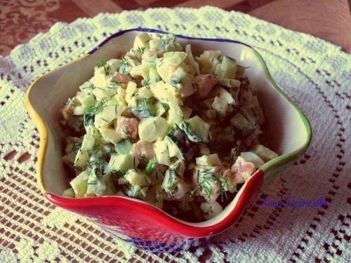 Свежий огурец, вареные куриные яйца, свежий укроп, копченый лосось, лук, майонез, горчица.