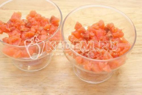 Уложить сверху кубиками нарезанные помидоры.