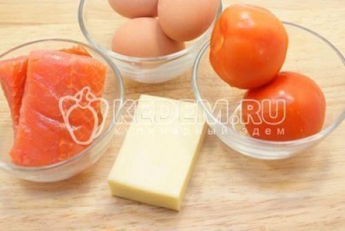 Яйца отварить, остудить и очистить. Натереть на терке сыр и яйца. Помидоры и рыбу мелкими кубиками нарезать.
