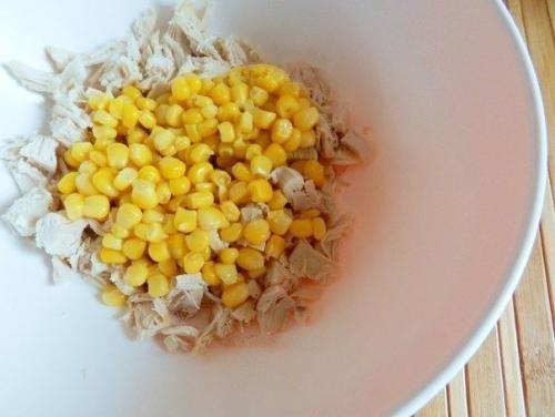 Грецкие орехи поджарить на сухой сковороде и крупно порубить или покрошить руками. Куриное Филе отварить в подсоленной воде до готовности. Куриное Филе остудить и нарезать небольшими кусочками. Смешать с кукурузой. Сыр натереть на терке, ананасы нарезать