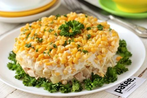 Салат с курицей и ананасом.. Выложить в салатницу, присыпать сверху грецкими орехами и наш вкусный салатик с курицей, сыром, ананасом и кукурузой готов.