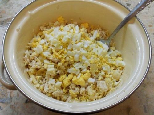 Также добавить в салат и рубленные вареные яйца с измельченным чесноком.