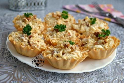 Очень вкусным салатом с ананасами и курицей наполнить тарталетки, сверху немного посыпать рубленными орехами и украсить зеленью. Подать тарталетки к столу! Приятного аппетита!