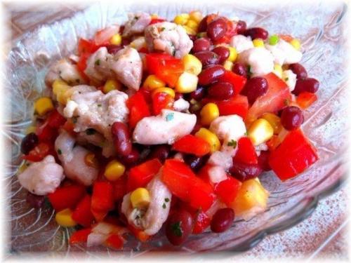 В миску выкладываем курицу, кукурузу, красную фасоль, зеленый перец, помидоры, петрушку, лук и мы заливаем соусом.
