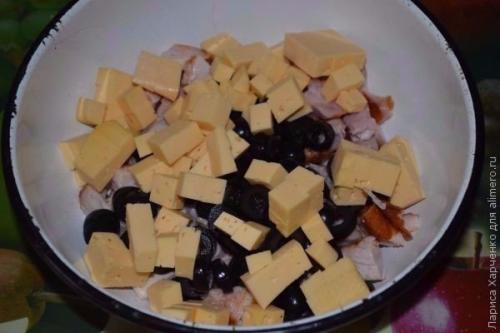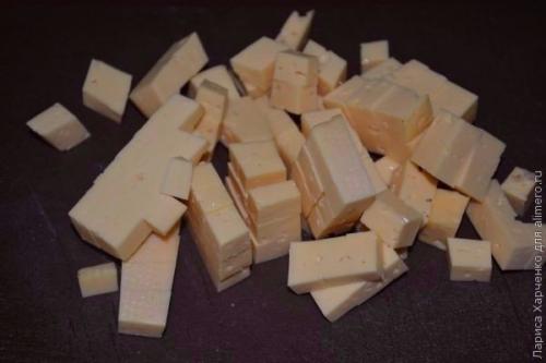 2. сыр твердых сортов нужно порезать красивыми кубиками среднего размера.