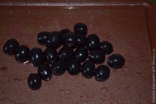 3. маслины лучше всего брать без косточек - их легко и просто можно нарезать аккуратными колечками.