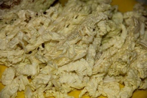 Сырое куриное Филе нарезаем полосками и мы обжариваем на сковороде до золотистого цвета. Куриное Филе нарезаем полосками и обжариваем на сковороде до золотистого цвета. Шампиньоны промываем тщательно. Кладём грибы в холодную воду, когда вода закипит уменьшаем огонь и отвариваем до готовности (приблизительно 8 - 10 минут. Затем разрезаем на 4 части. Шампиньоны отвариваем и разрезаем на 4 части. Пекинскую капусту мелко шинкуем.