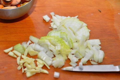 2. обжарьте лук и чеснок на оливковом масле, пока лук не станет прозрачным.