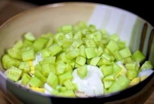 4. огурцы очищаем от кожуры, нарезаем кубиками и вкладываем в миску.