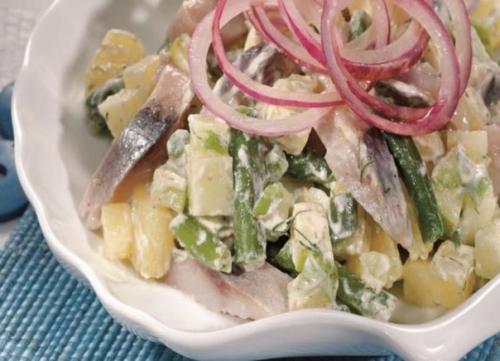 Смешать картофель, яйца, селедку, лук, яблоко. Заправить майонезом. Приятного аппетита!