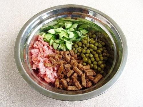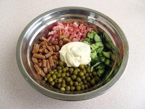 Для приготовления салата нужно взять копчёную колбасу, сухарики к пиву с чесноком (можно другие), консервированный зелёный горошек, свежий огурец, майонез и соль.