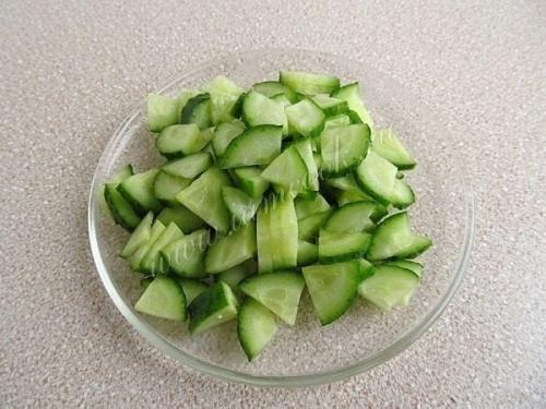 Огурец вымыть, разрезать вдоль на четыре части и тонко нарезать поперёк.