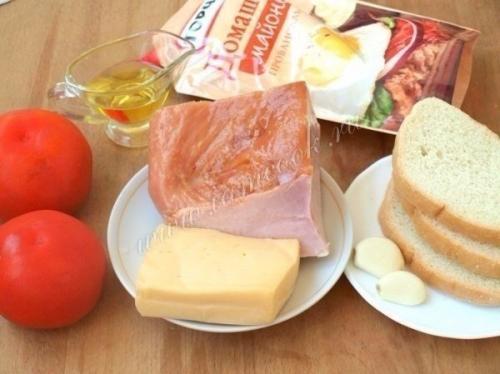 5. соединить в миске помидоры, ветчину, сыр и сухарики, выдавить чеснок. Заправить салат майонезом.