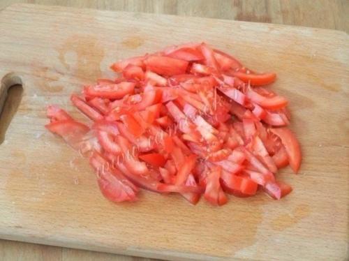 4. помидоры нарезать соломкой. Затем также нарезать ветчину.