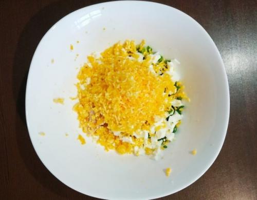 Яйца отвариваем, остужаем и мы чистим. Печень трески в глубокую миску выложим. Таким образом, если у вас печень кусочками то порежем. Зеленый лук помоем, мелко покрошим и добавим к печени трески. Яйца на белки и желтки разделим. Белки нарежем мелким кубиком и отправим в салат. Желтки разомнем вилкой или натрем на мелкой терке. Добавляем в салат