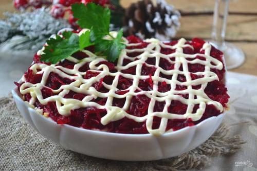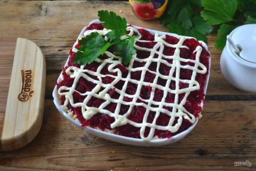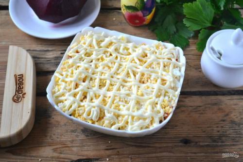 6. сверху, как и в обычной селедке под шубой, выложите натертую на мелкой терке свеклу.