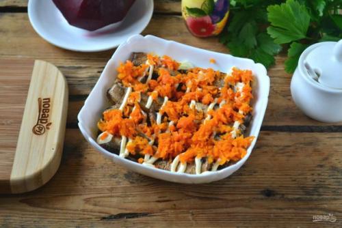 4. третьим слоем будет морковь, натертая на мелкой терке.