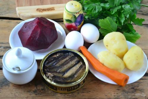 1. подготовьте все необходимые ингредиенты. Картофель, морковь и свеклу заранее отварите в кожуре до готовности. Я варю все в одной кастрюле, через 30 минут после закипания достаю картофель, еще через 10 минут - морковь, а затем варю свеклу еще 30-40 минут.