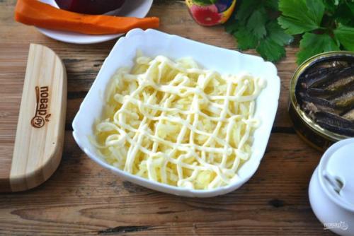 2. на дно глубокой тарелки выложите натертый на крупной терке картофель. Смажьте майонезом или просто сделайте майонезную сеточку.