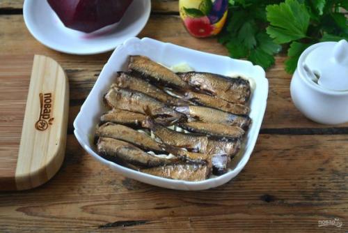 3. затем ровным слоем выложите шпроты - и снова майонез.