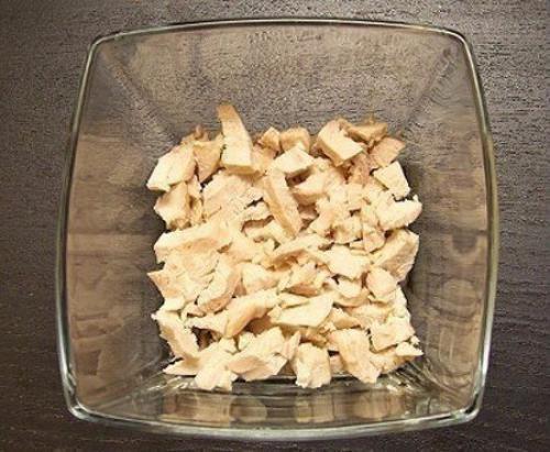 1. шампиньоны мы чистим и моем. Режем их. Обжариваем грибы на подсолнечном масле до золотистого цвета. Солим. Остужаем. Отварную куриную грудку режем соломкой. Её на дно салатницы укладываем. Поливаем сметаной. Мелко режем лук. Выкладываем лук.