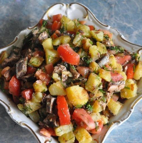 Картофель отварить, охладить, нарезать кубиками и обжарить.