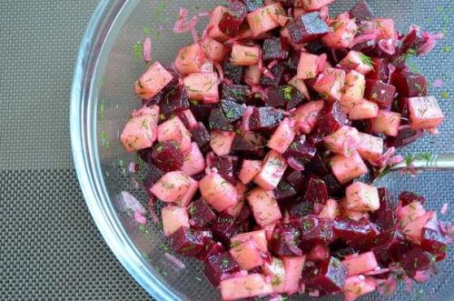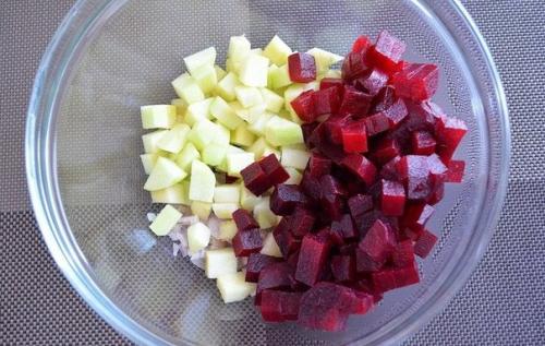 2. нарезать отварную свеклу кубиками.