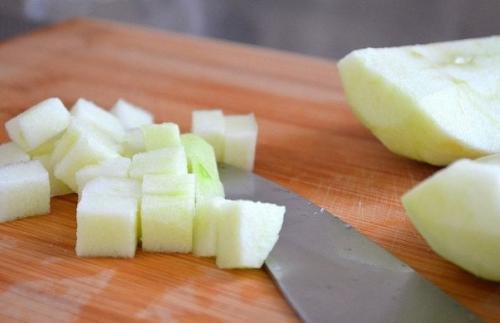 1. зеленое яблоко очистить и нарезать кубиками. Сбрызнуть лимонным соком.