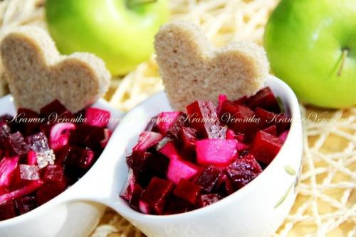 Лук нарезать полукольцами, залить маринадом (уксус, сахар) и оставить мариноваться на 1 час. Можно лук любым другим способом замариновать. Свёклу отварить, остудит, почистить и нарезать на кубики. Яблоко очистить от кожуры и нарезать кубиками. Соединить свёклу, яблоко, лук. Посолить по вкусу, добавить растительное масло и чёрный перец. Всё хорошо перемешать