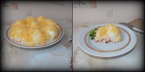 5. готовый салат поливаем майонезом и посыпаем сыром.