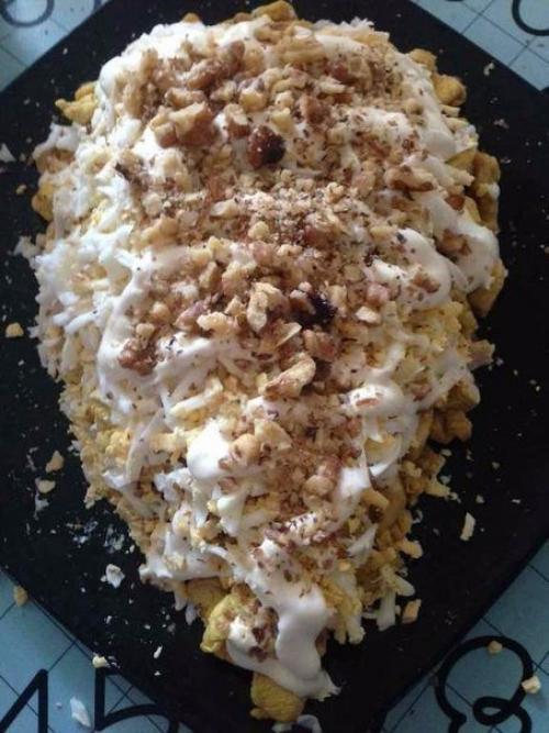 3. начинаем собирать салат. Филе выкладываем в виде виноградной грозди. Смазываем майонезом и посыпаем измельченными орехами. Затираем яйца, смазываем майонезом и также посыпаем орехами. Последним слоем натираем сыр, смазываем майонезом и посыпаем орехами.