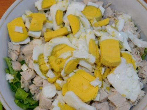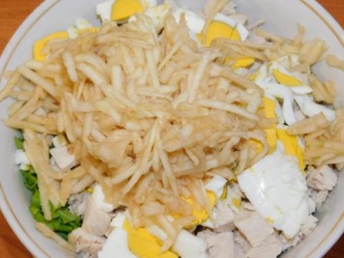 Мы подготовим все необходимые ингредиенты. Отвариваем яйца и куриное Филе. Моем яблоки, листья салата и огурец. Огурец нарезаем кубиками. Добавляем нарезанные листья салата. Куриное Филе нарезаем кубиками. Добавляем нарезанные яйца. Яблоко натираем на крупной терке. Заправляем салат майонезом и перемешиваем