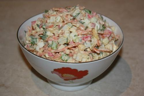 Морковь выложить в салатник (я порезала помельче), сыр натереть на кр. Терке, крабовые палочки нарезать.