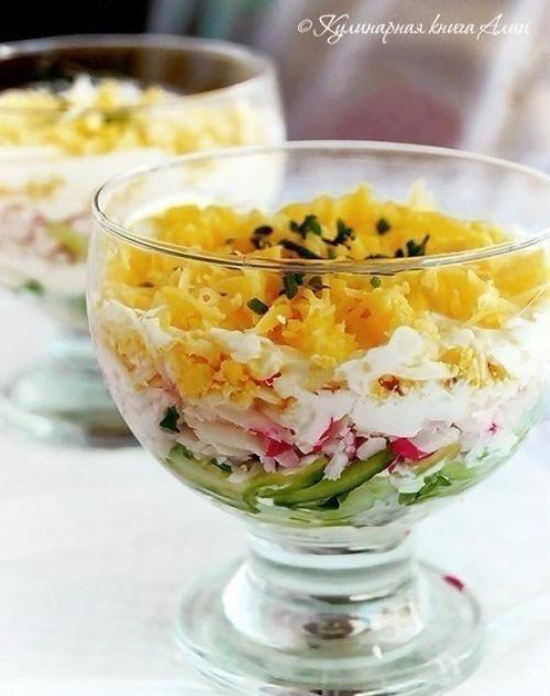 3 слой - крабовые палочки натереть на тёрке, смазать майонезом;.
