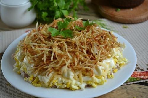 Можно выложить слои в любом порядке. Красиво будет смотреться тоненькая хрустящая картошка, выложенная поверх салата.