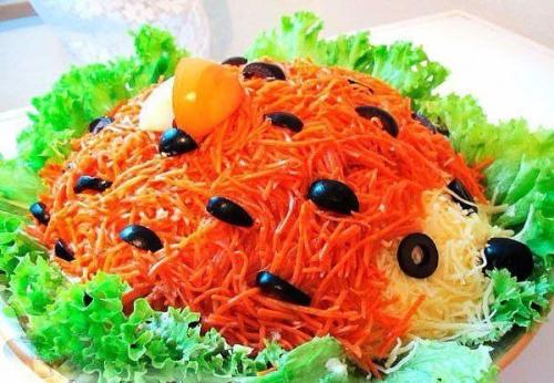 Слоеный салат в виде ежика. Быстро, просто и вкусно!