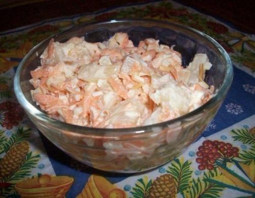 Морковь трем на терке, сыр мелко режем, брусочками режем ананас чесночок трем на терку или или пропускаем через чесночницу, все смешиваем, мы заправляем небольшим количеством майонеза. Солить не нужно!