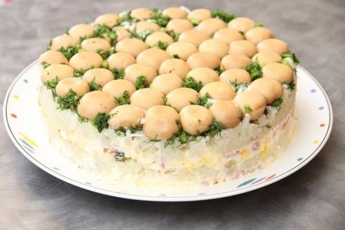 2. выложить слой мелко нарезанного отварного куриного Филе. Смазать майонезом. Последним слоем выложить тертый сыр. Убрать салат в холодильник на пару часов. Перевернуть форму с салатом на блюдо и аккуратно снять. Не снимайте быстро, возможно, стоит немного подождать, и салат сам выскользнет из формы. Салат "Грибная Поляна" готов. Можно подавать к праздничному столу.