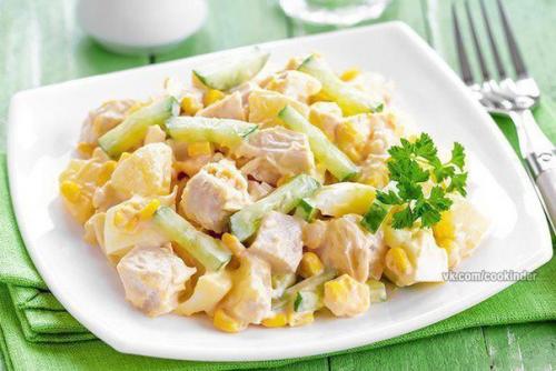 5. на блюдо кладем листья салата. Смешиваем курицу, кукурузу, огурец и сельдерей, солим по вкусу и выкладываем на салат. Поливаем заправкой и подаем.